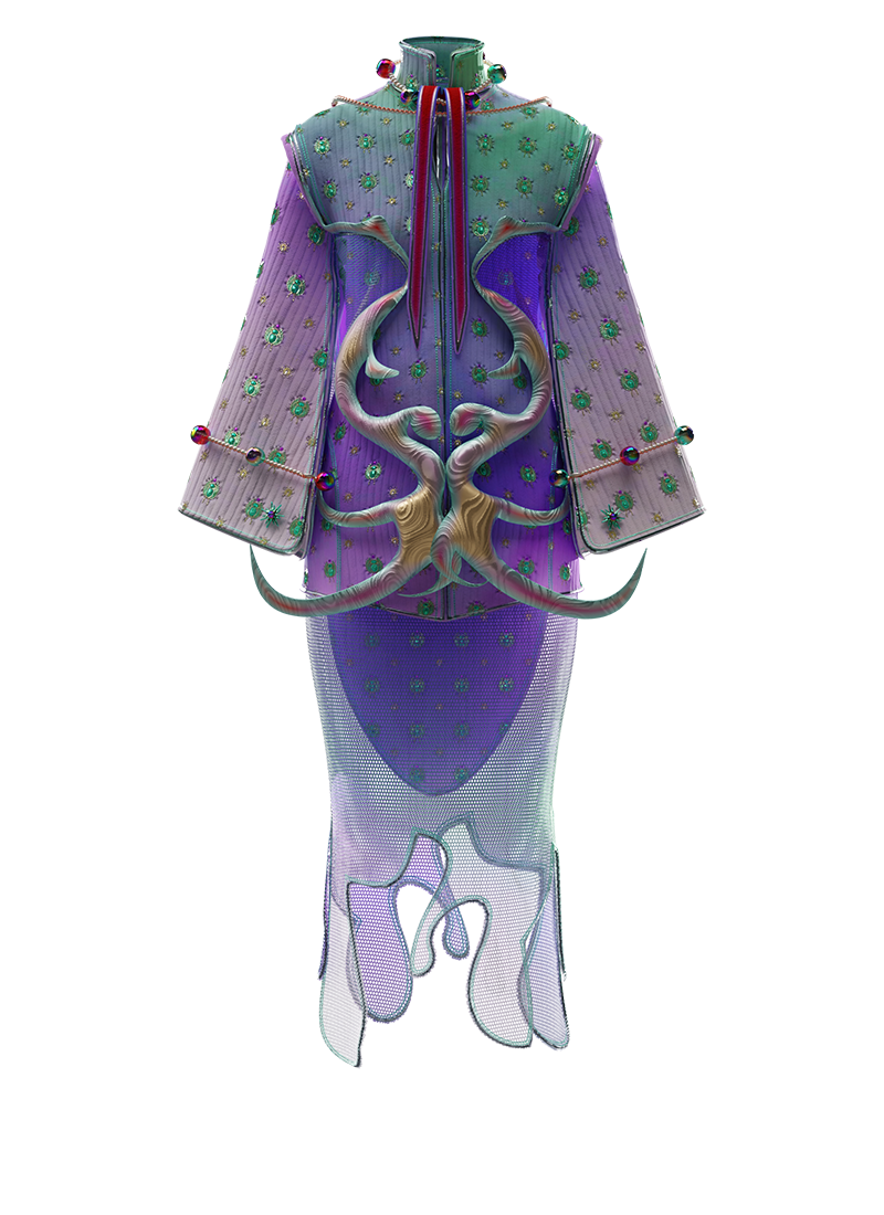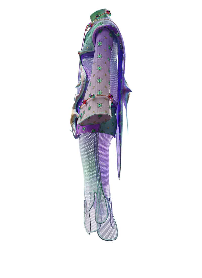 This uniform is inspired by Aura which is displayed as a gradient repelling and attracting different energy layers and colours. The whole look gives a feeling of dreaminess and mystery.